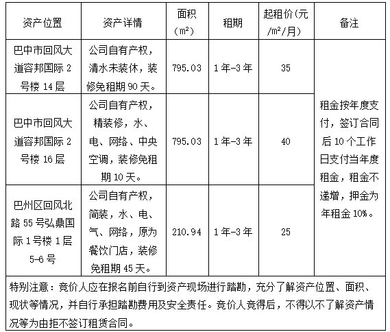 根據(jù)國有資產(chǎn)管理相關(guān)規(guī)定,巴中自然資源投資集團(tuán)有限公司決定對相關(guān)資產(chǎn)進(jìn)行公開招租。現(xiàn)將有關(guān)事項公告如下: